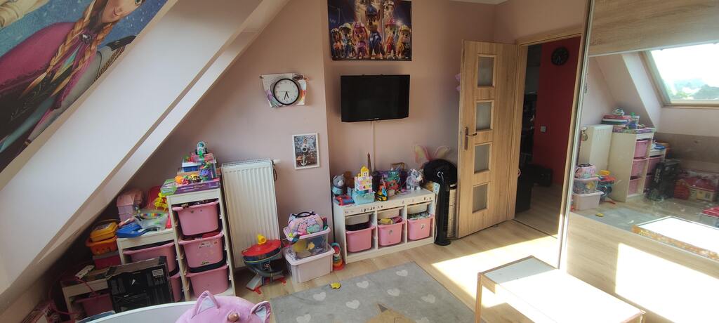 W pokojach na podłodze panele, w kuchni terakota, ściany gładkie malowane, okna drewniane nowego typu, w małym pokoju okna połaciowe.