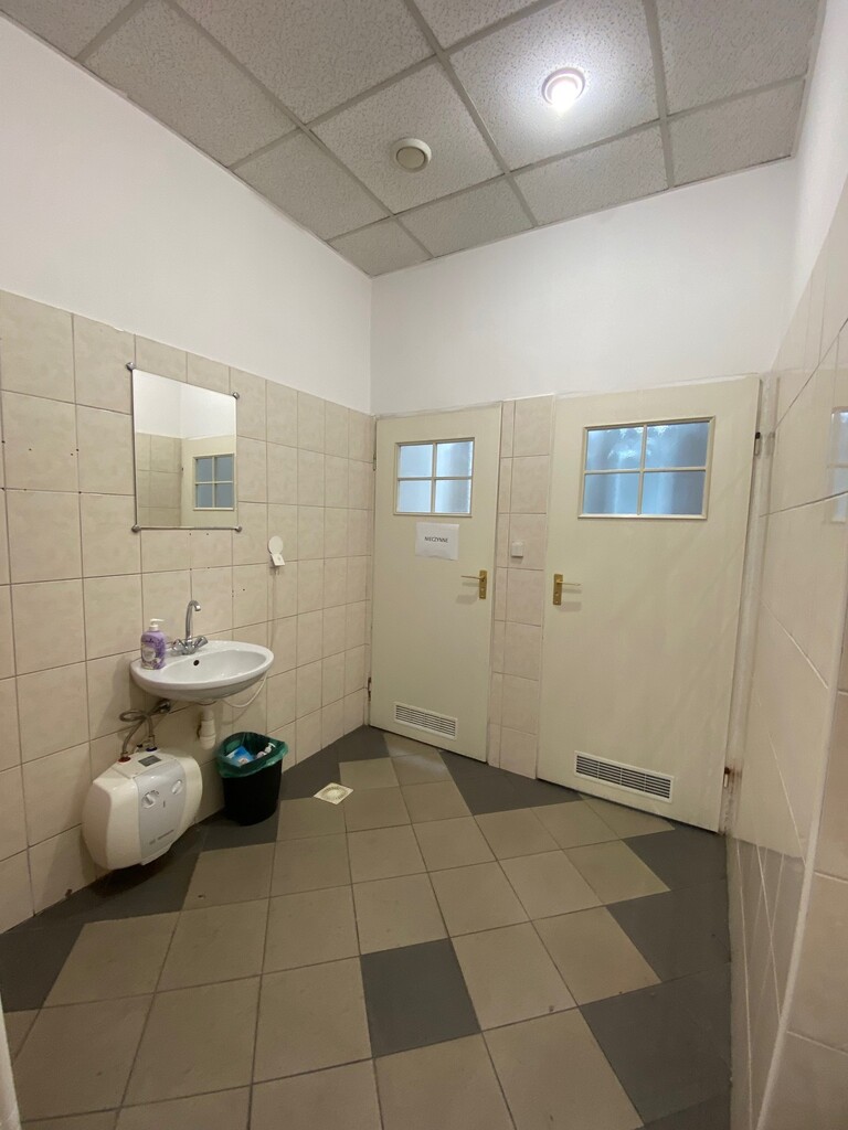 • Wysokość pomieszczeń: oryginalnie około 4 m, obecnie z podwieszonymi sufitami na wysokości około 3 m