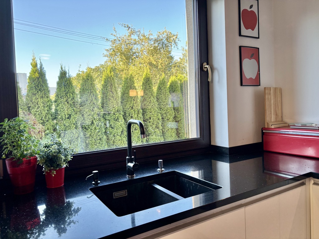 • Nowoczesna kuchnia w zabudowie na wymiar z granitowym blatem Galaxy Star, wyposażona w sprzęt AGD (lodówka side by side, piekarnik, zmywarka, płyta grzewcza licowana w blacie, podwieszany zlew),