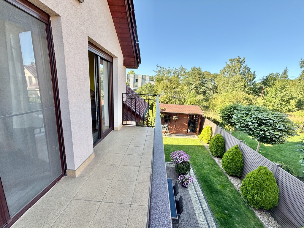 Dom usytuowany jest na działce o powierzchni 354 m², z pięknie zagospodarowanym ogrodem wyposażonym w automatyczny system nawadniania Rain Bird.