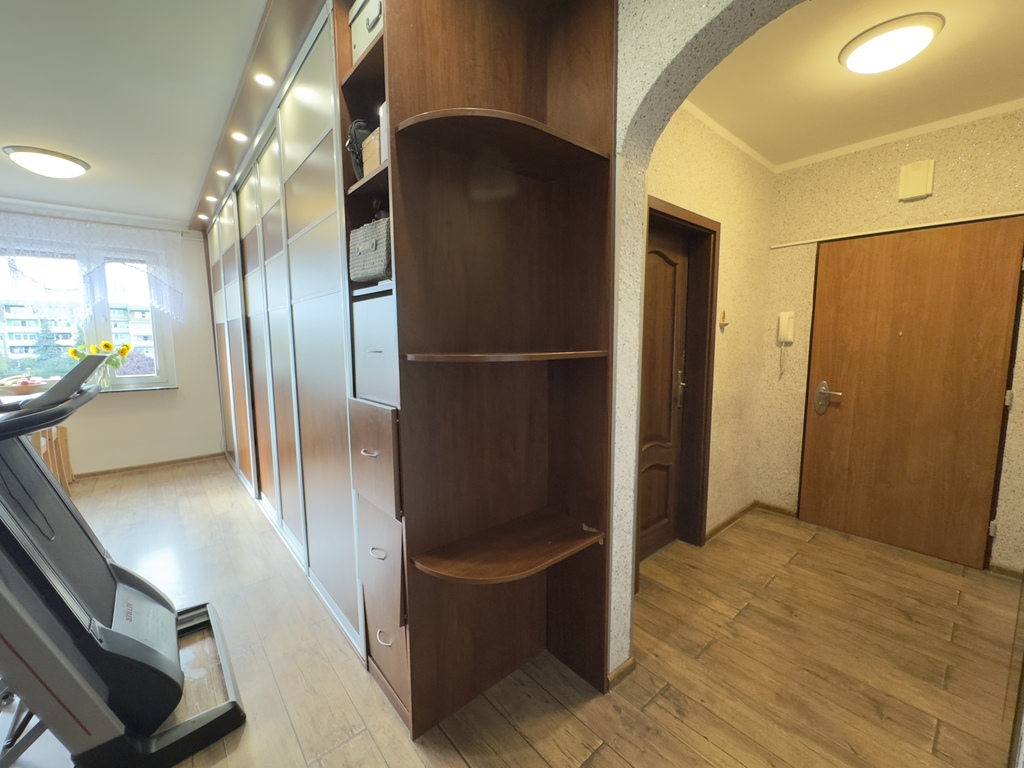 Mieszkanie jest w pełni rozkładowe. Niezwykłą zaletą jest to, że okna wychodzą na trzy strony świata, dzięki czemu wnętrza są bardzo jasne i dobrze doświetlone. W części przedpokoju, kuchni oraz w łazience znajdują się pojemne szafy.