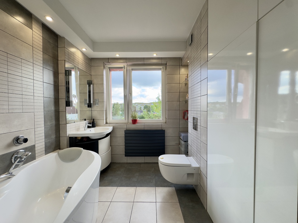 * łazienka z oknem, wyposażona w wannę z funkcją prysznica, WC, umywalkę oraz lustro z oświetleniem,