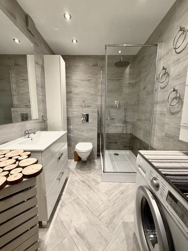 - łazienka w glazurze i terakocie z kabiną prysznicową