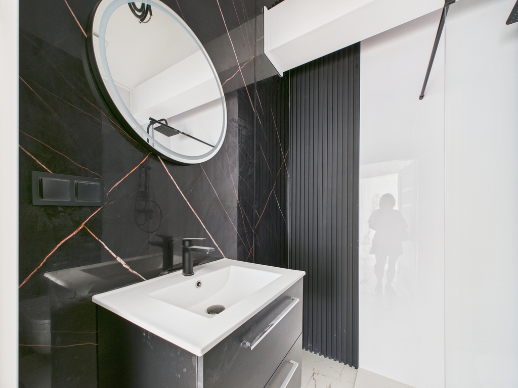 * nowoczesna łazienka z designerskimi elementami: czarna armatura, duże lustro, stylowe wykończenia;