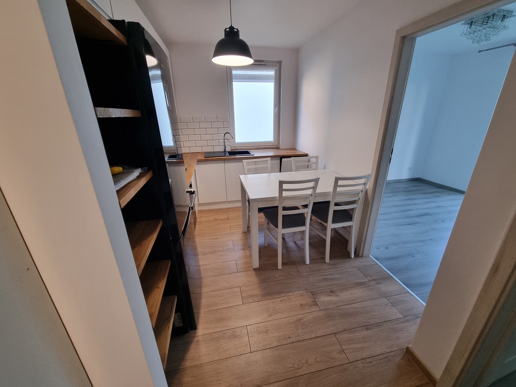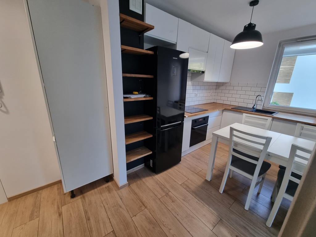 Ścianę dzielącą pokój i kuchnię można wyburzyć uzyskując tym samym większą przestrzeń.