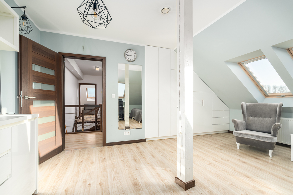 Pełne umeblowanie, w przedsionku i sypialniach przemyślane zabudowy na wymiar, szafy i garderoba.