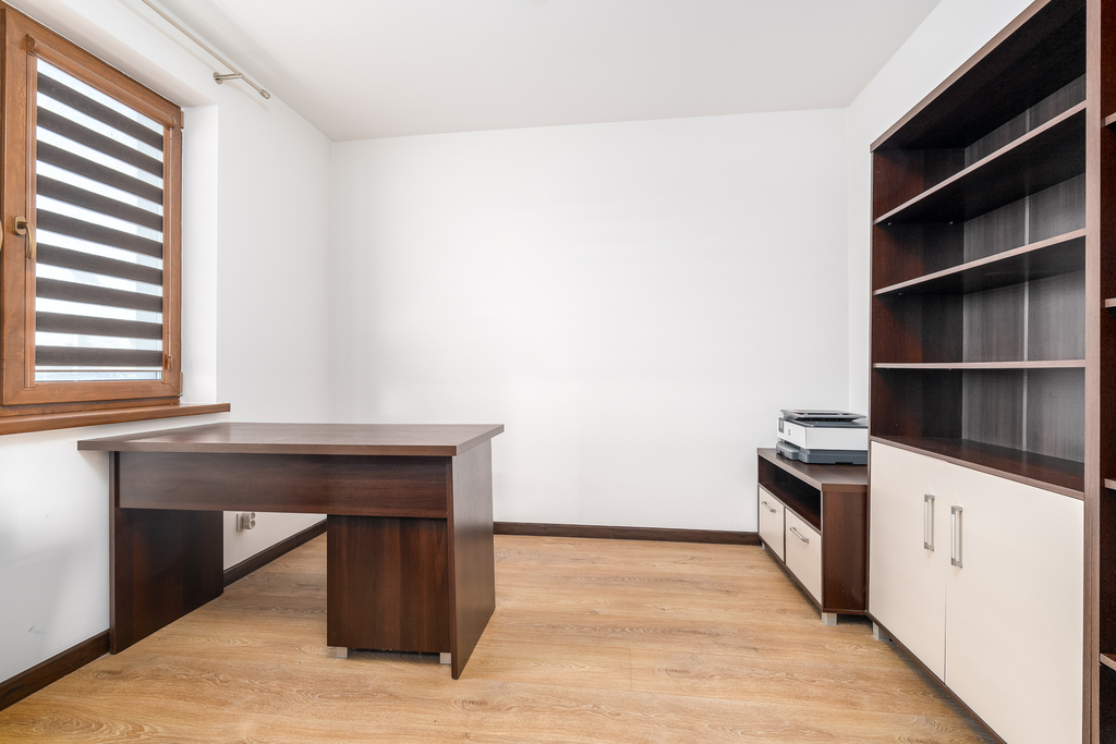 Układ: Na parterze przestronny salon, kuchnia z jadalnią, dodatkowy gabinet, łazienka z pomieszczeniem gospodarczym i garaż. Na poddaszu trzy komfortowe sypialnie i duża łazienka.
