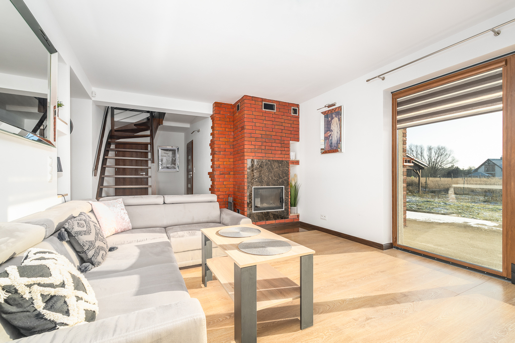 Kominek z DGP: W salonie znajduje się kominek z systemem rozprowadzenia ciepła także na piętro – idealny na zimowe wieczory jako klimatyczny i alternatywny system grzewczy.