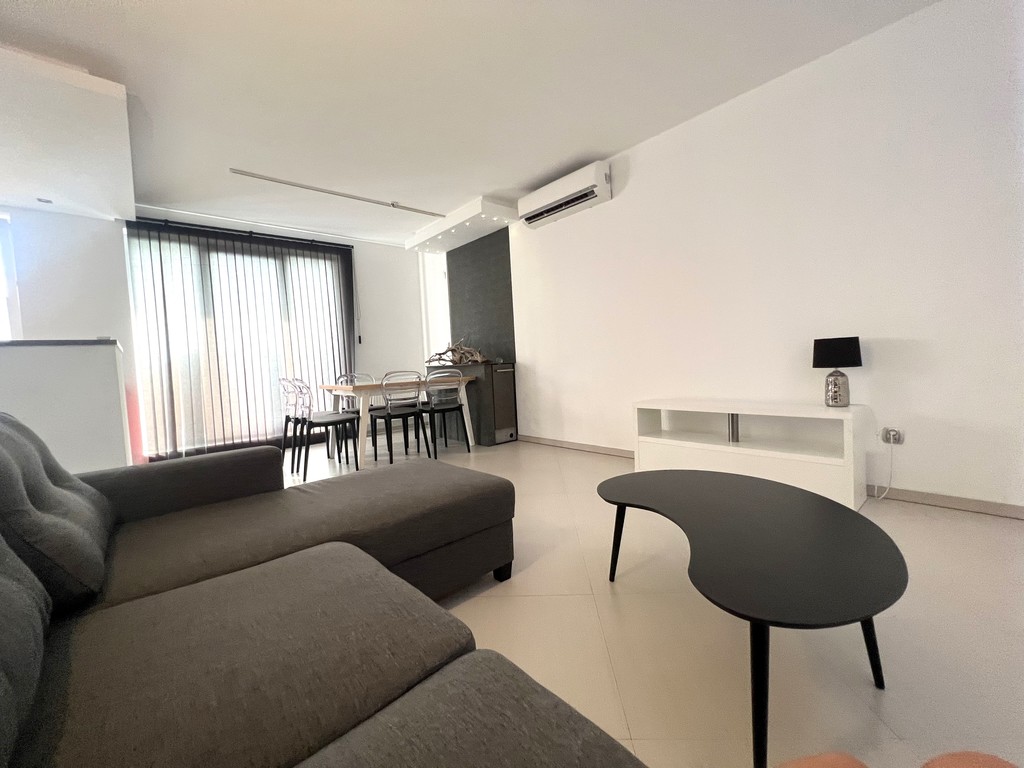 Salon wyposażony w rozkładaną sofę, stół z krzesłami (możliwość dostawienia telewizora) oraz klimatyzację.