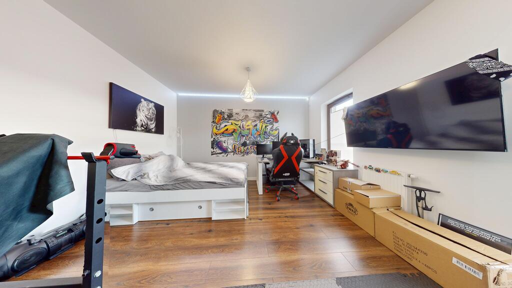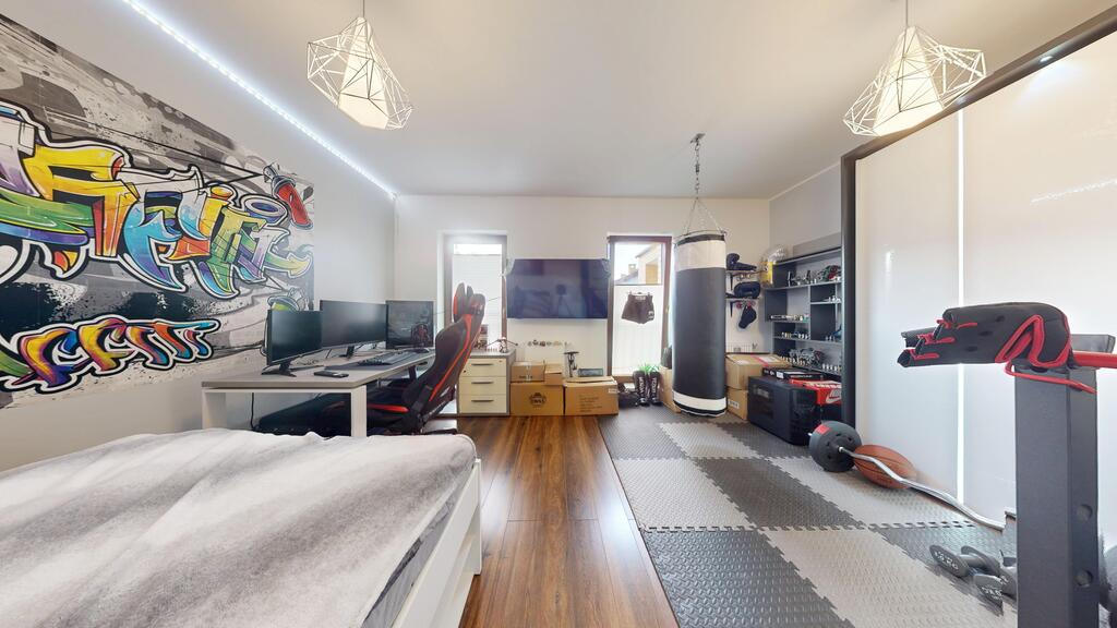 - duża sypialnia powstała w wyniku połączenia 2 pokoi,