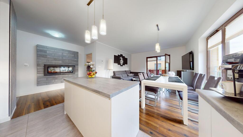 - przestronny, niesamowicie doświetlony salon z aneksem kuchennym. Zabudowa kuchenna aż do sufitu, wysokiej jakości, robiona na wymiar wraz z wyspą. Z salonu wychodzi się na bardzo słoneczny taras z południową wystawą,