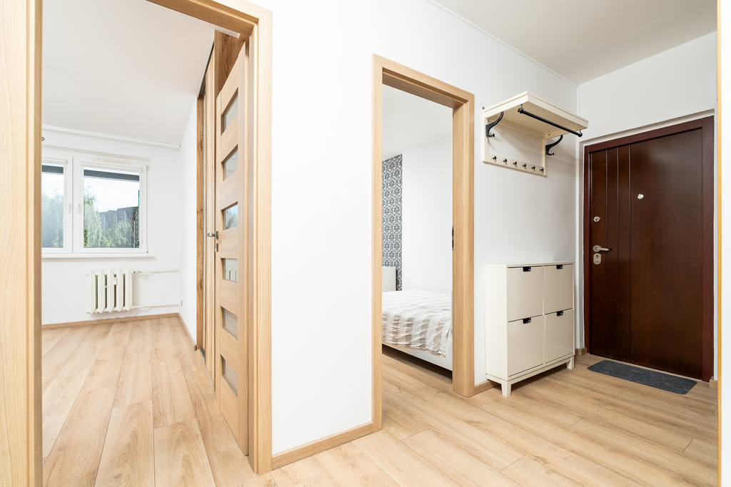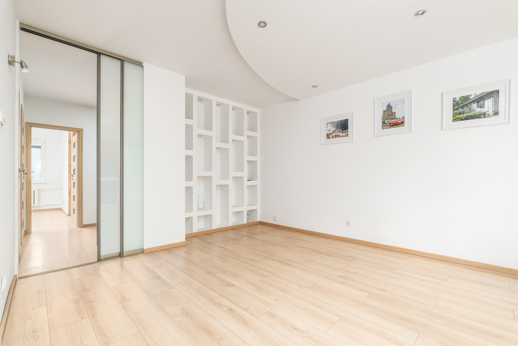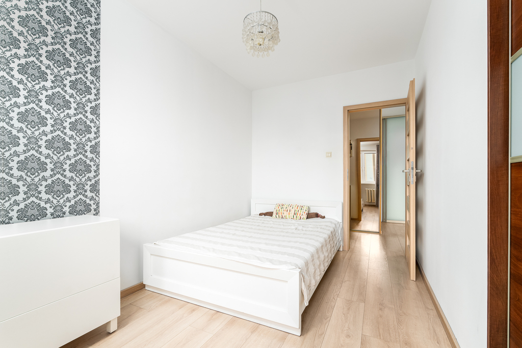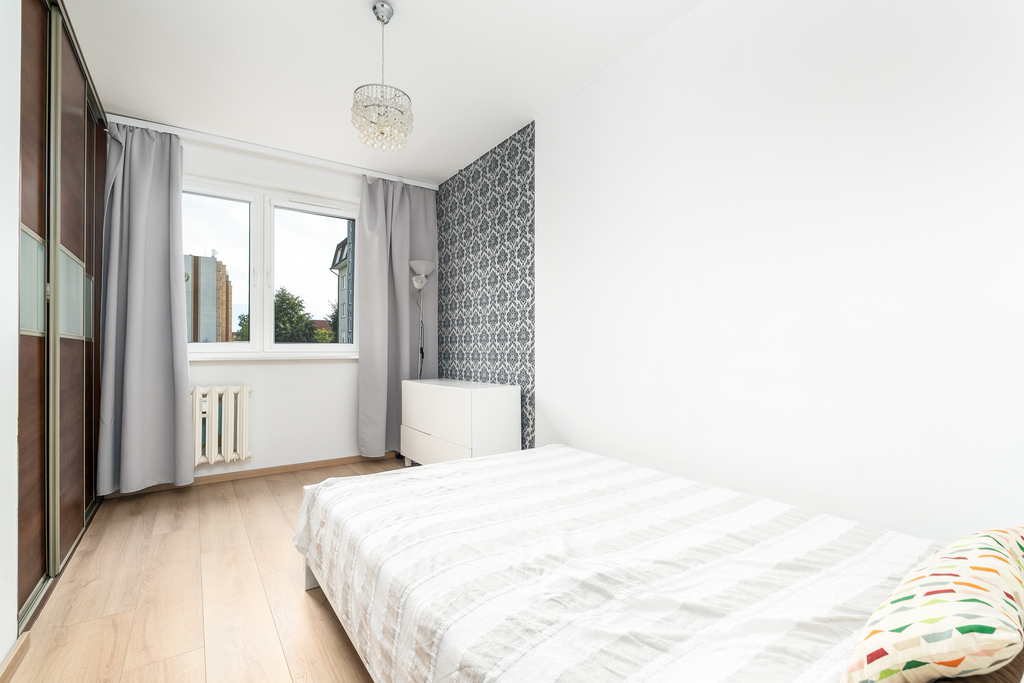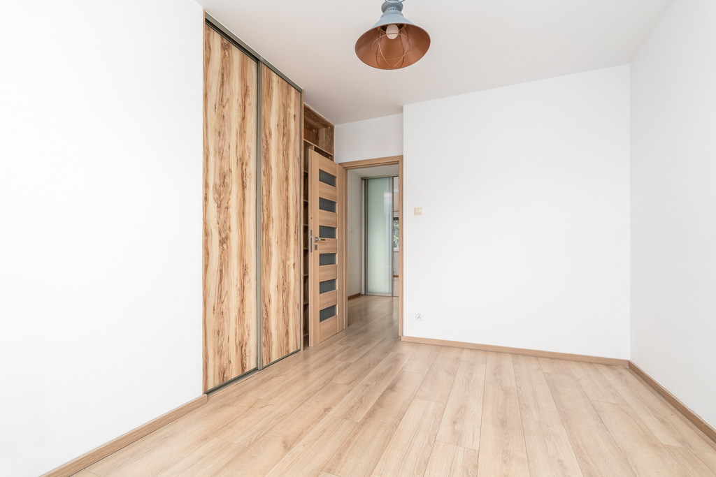 • Dwie sypialnie (jedna duża z szafą w zabudowie, druga mniejsza także z szafą).