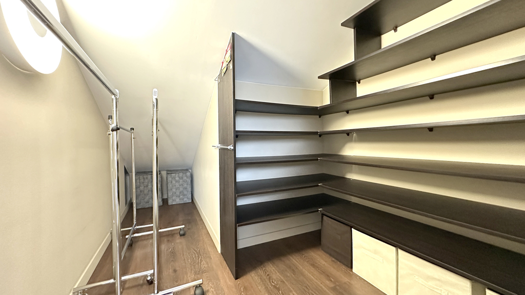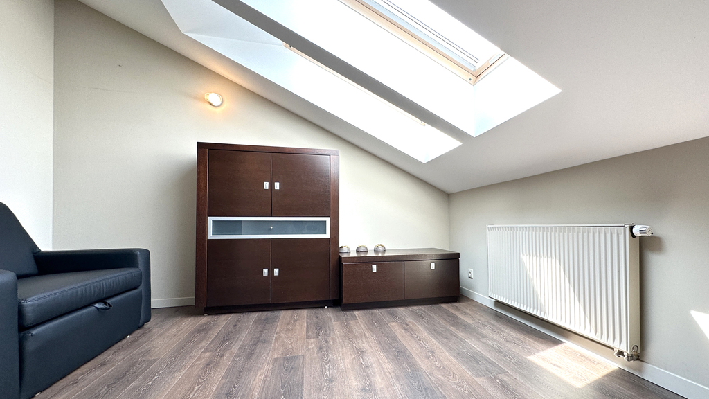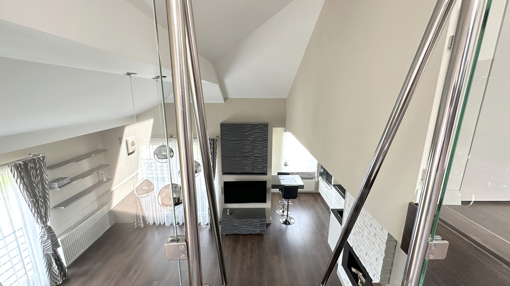 Antresola z dwoma oknami połaciowymi może pełnić rolę biura lub dodatkowego pokoju. Ustawiona jest tam rozkładana kanapa oraz szafki. Na antresoli znajduje się również bardzo duża i wygodna garderoba z półkami oraz wieszakami na ubrania.