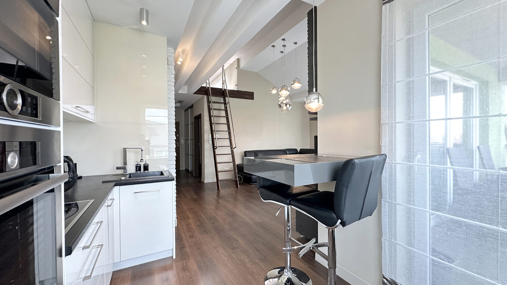 Aneks kuchenny z oknem wyposażony jest z w nowoczesne i energooszczędne urządzenia: płyta indukcyjna, piekarnik, wysoka lodówka, zmywarka, mikrofalówka.