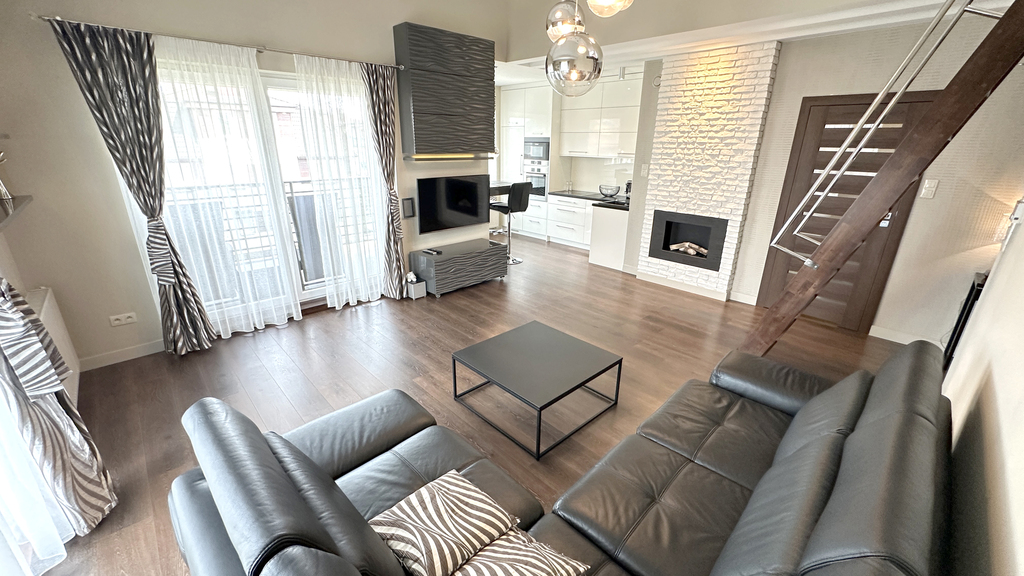 Salon z panoramicznymi oknami wyposażony jest w dużą, wygodną ,narożną kanapę, stolik, szafkę oraz zawieszony na ścianie telewizor oraz elektryczny, klimatyczny kominek. Z salonu można wyjść na balkon o pow. około 10 m kw. na którym znajdują się fotele oraz stolik.