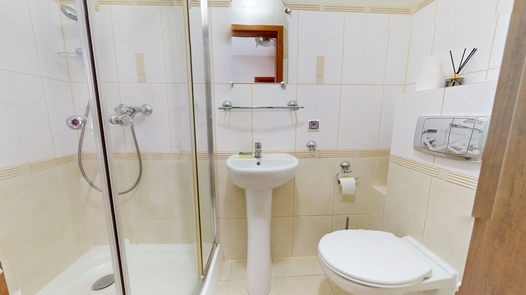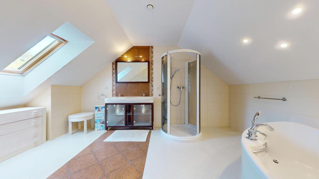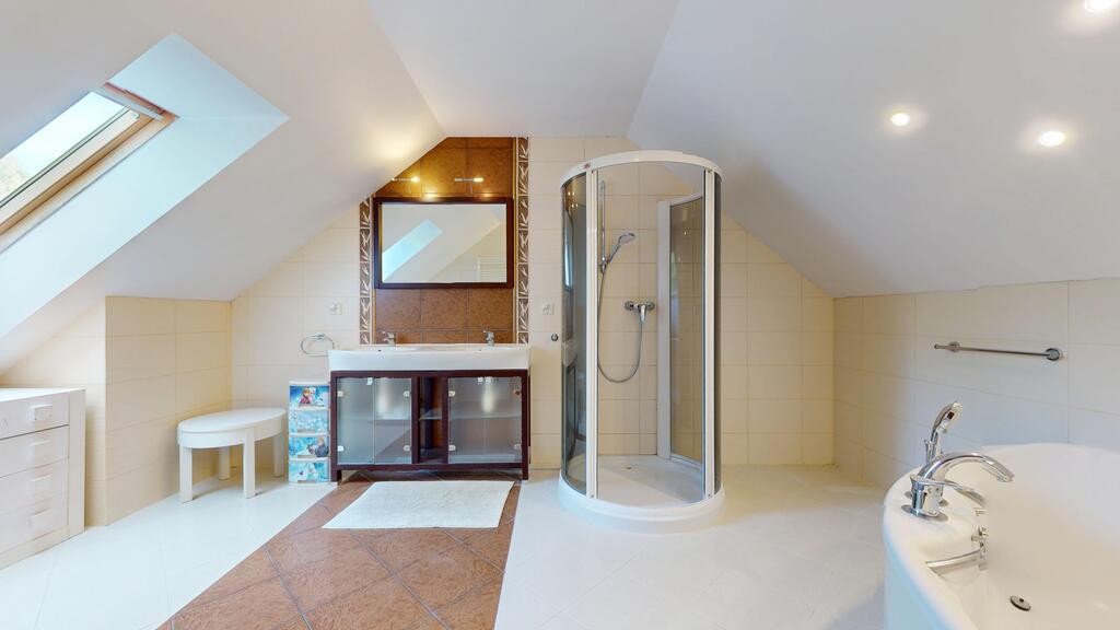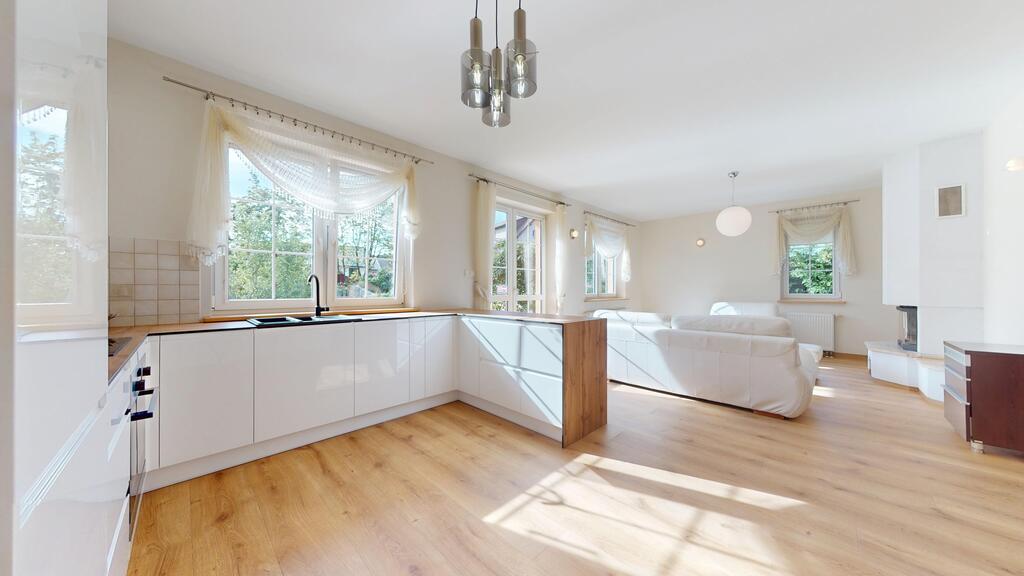 Wnętrze domu utrzymane w jasnych kolorach: biel, szarość, beż. Duża kuchnia zabudowana nowymi meblami na wymiar ze sprzętem AGD. Dwie łazienki: odpowiednio z prysznicem lub wanną.