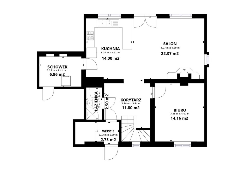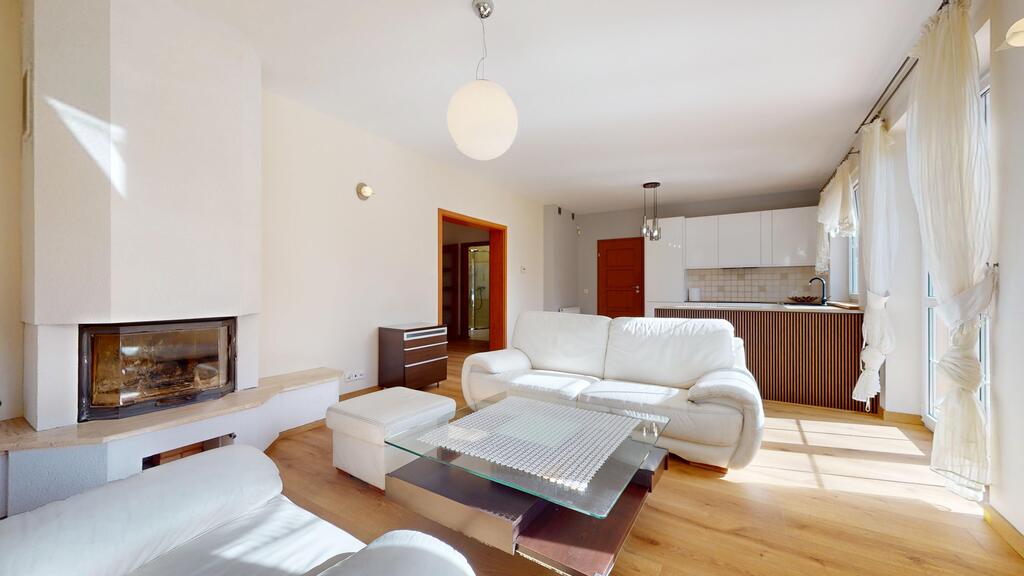 - część dzienna; salon z kominkiem połączony z jadalnią i kuchnią z wyjściem na taras
