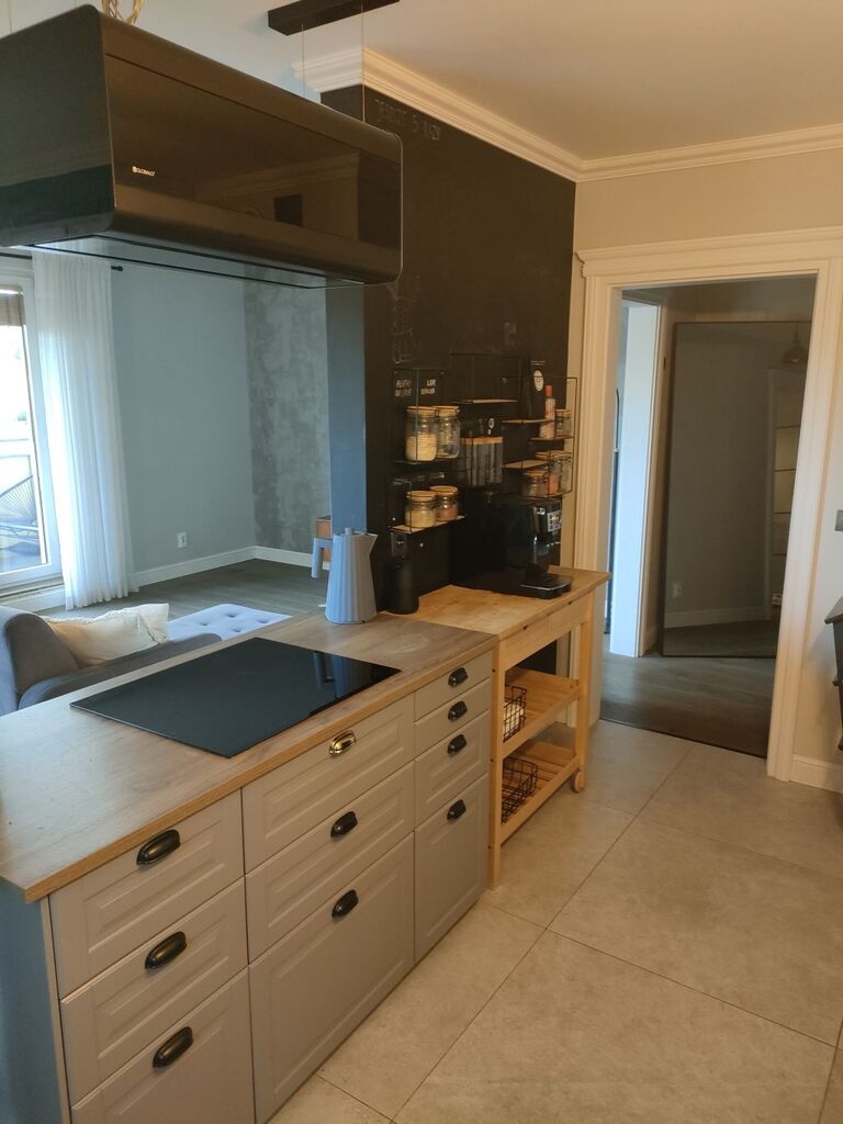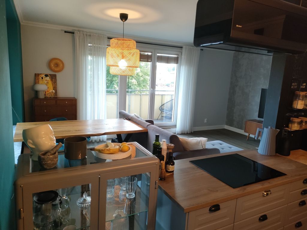 Kuchnia w mieszkaniu otwarta jest na ładny ustawny salon z wyjściem na duży taras.