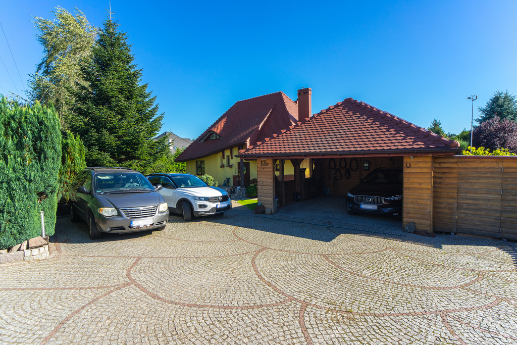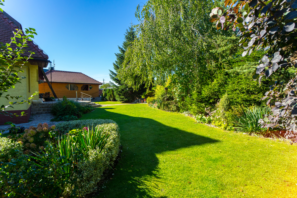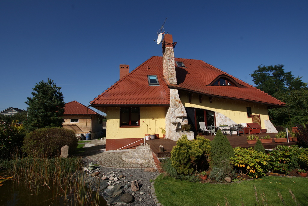 Działka zagospodarowana z wydzieloną częścią warzywną, gospodarczą i zadbanym oczkiem wodnym. Duży taras z zewnętrznym kominkiem. Automatyczna brama wjazdowa na wyłożony kostką podjazd z kilkoma miejscami parkingowymi. Garaż dwustanowiskowy z oddzielnym pomieszczeniem gospodarczym.