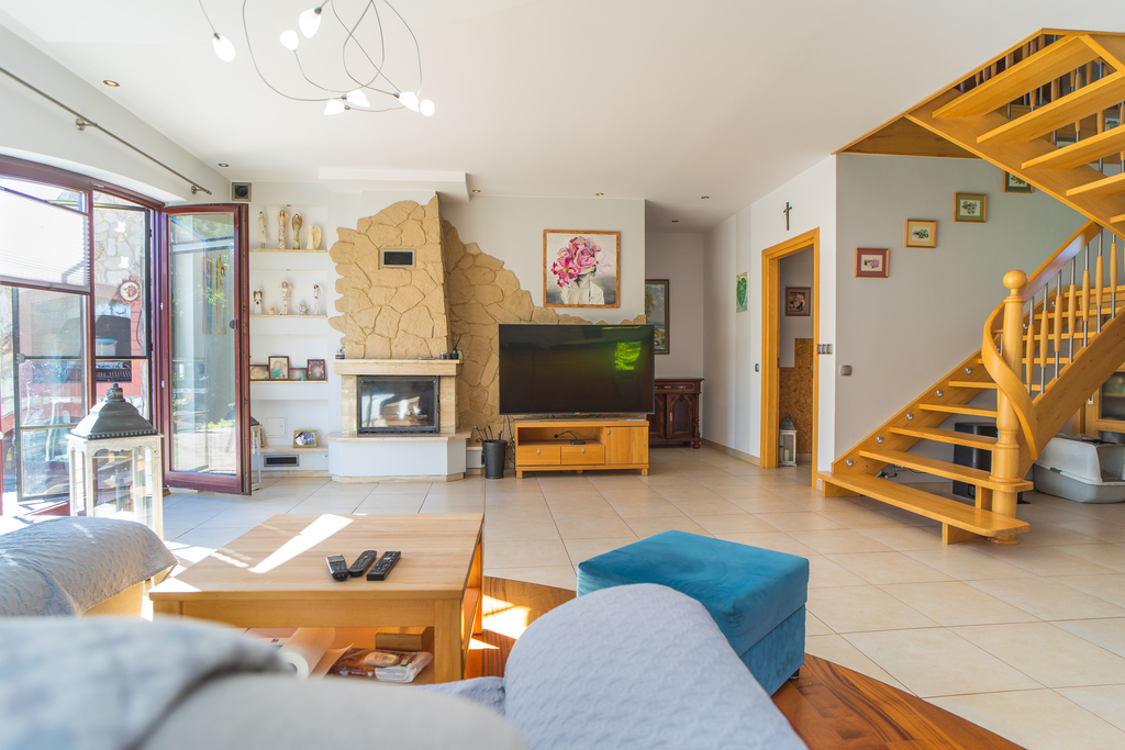 - salon z kominkiem i wyjściem na duży taras,