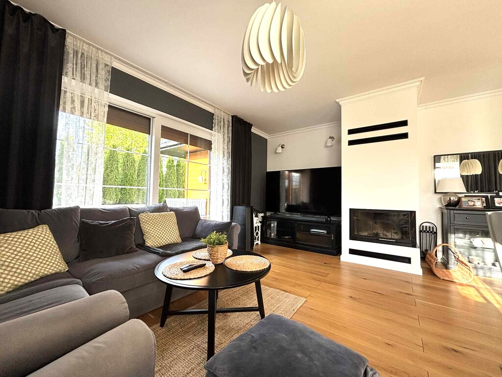 Z salonu wyjście na komfortowy taras (23 m2) i dalej do pięknego ogrodu. W salonie narożny kominek.
