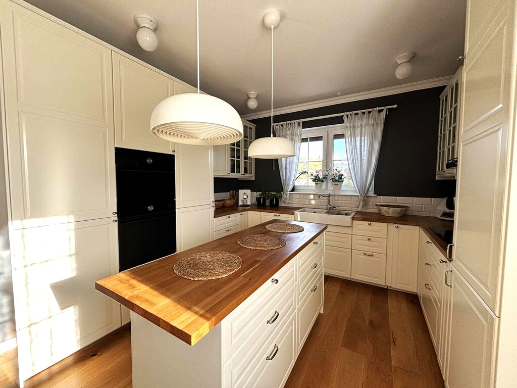 W cenie domu zostaje ponadczasowa drewniana zabudowa meblowa w kuchni wraz z kompletnym wyposażeniem, meble znajdujące się w wiatrołapie, zabudowa garderoby i meble w łazience.