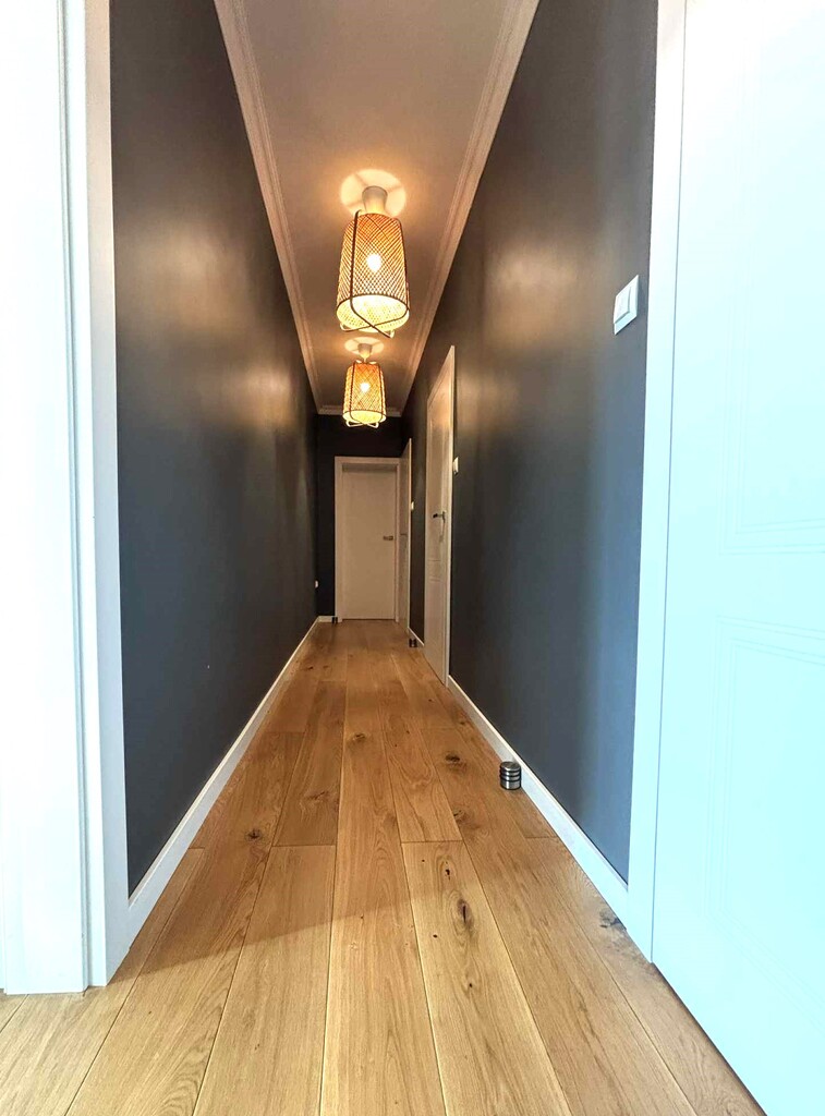 - ściany gładzone w efektownej kolorystyce, z dekoracyjnymi listwami przysufitowymi, które sprawiają, że wnętrze wygląda bardzo elegancko i luksusowo