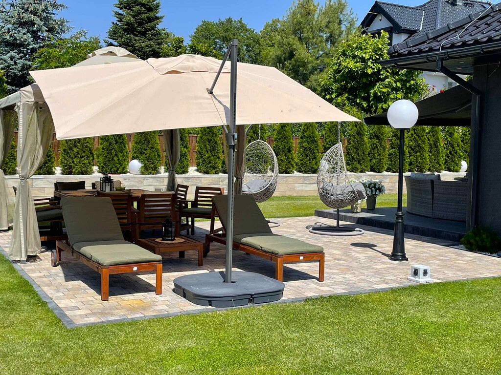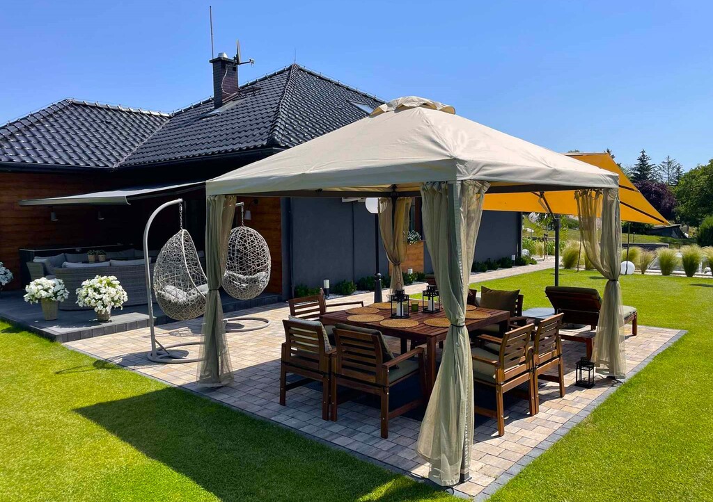 Nad tarasem zamontowana została duża, elektrycznie sterowana markiza, co pozwala na korzystanie ze strefy wypoczynku nawet w słoneczne lub lekko deszczowe dni. W ogrodzie zainstalowano system nawadniania trawnika, a także kosiarkę samojezdną, która pozostaje w cenie.