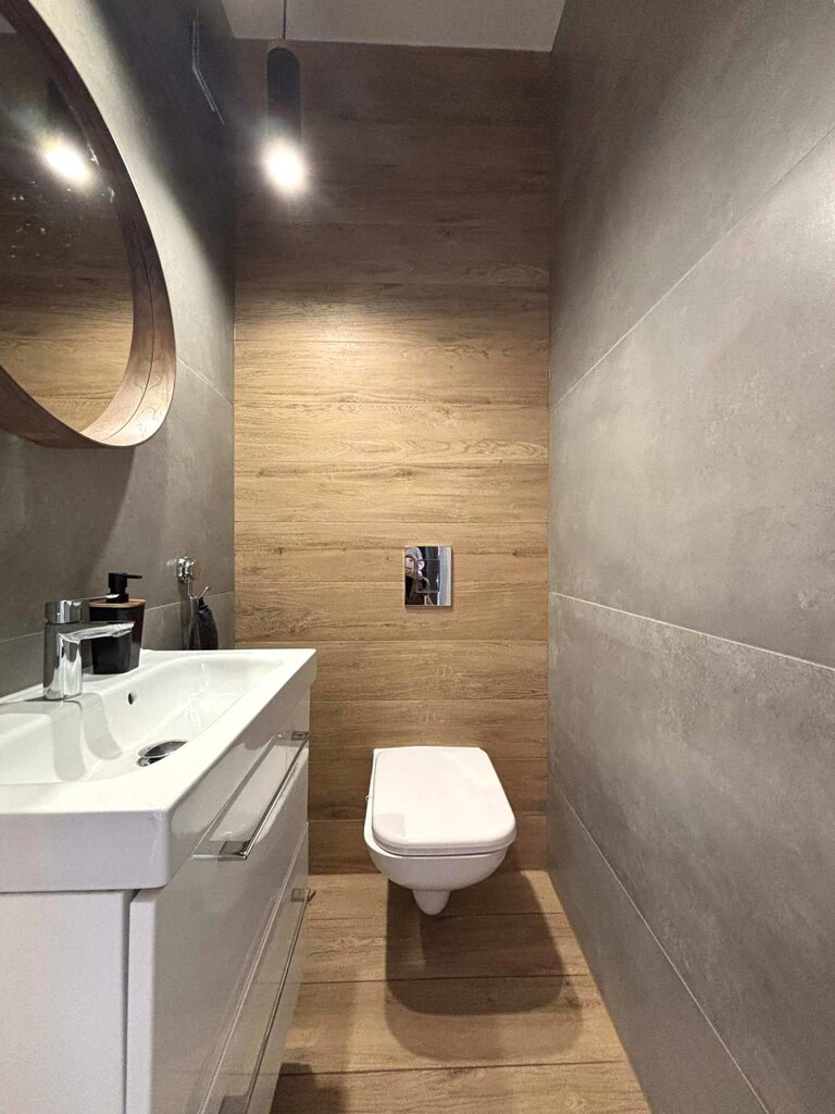 Łazienka i wc wykończone w pastelowej kolorystyce, sanitariaty dobrej klasy.