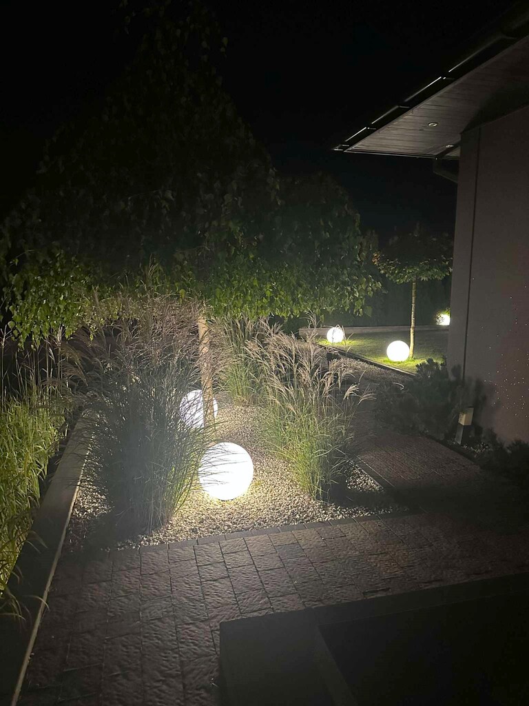 Piękny ogród zaprojektowany przez architekta krajobrazu. Bardzo przemyślana koncepcja, która pozwoliła na efektowne i funkcjonalne rozmieszenie roślin, tarasów, kącika wypoczynkowego, altany, a także doboru oświetlenia, które stwarza magiczną atmosferę po zmroku .