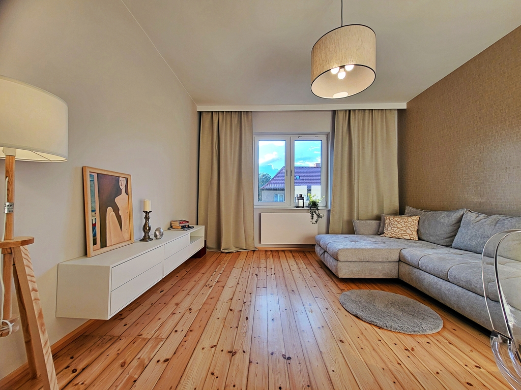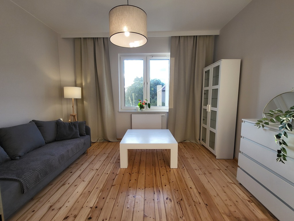 Oryginalne, wycyklinowane podłogi. Mieszkanie kompletnie umeblowane, posiada narożnik oraz sofę z funkcją spania. Kuchnia z kompletem sprzętu agd oraz zabudowaną pralką.