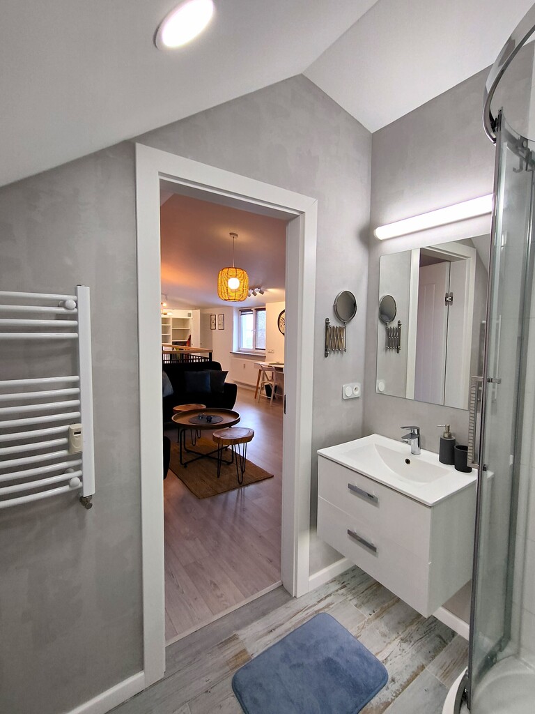 Apartament ma powierzchnię całkowitą 71,7 m² (użytkowa 40,64 m²) i składa się z: