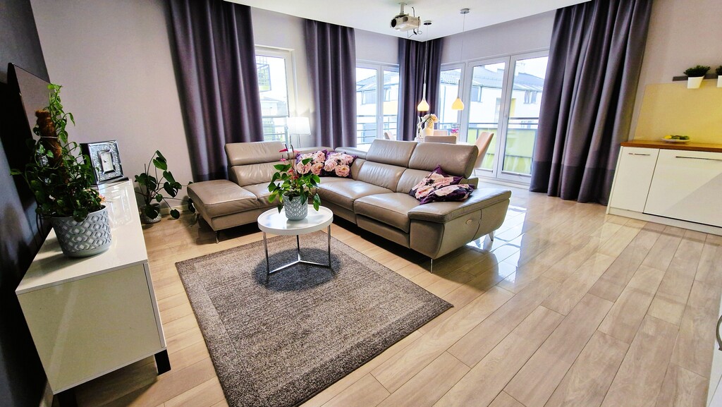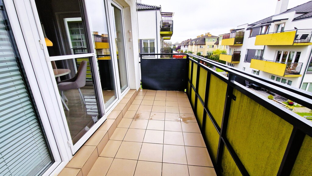 Dodatkowo duży balkon z markizą, z widokiem na ogrody i tereny zielone.