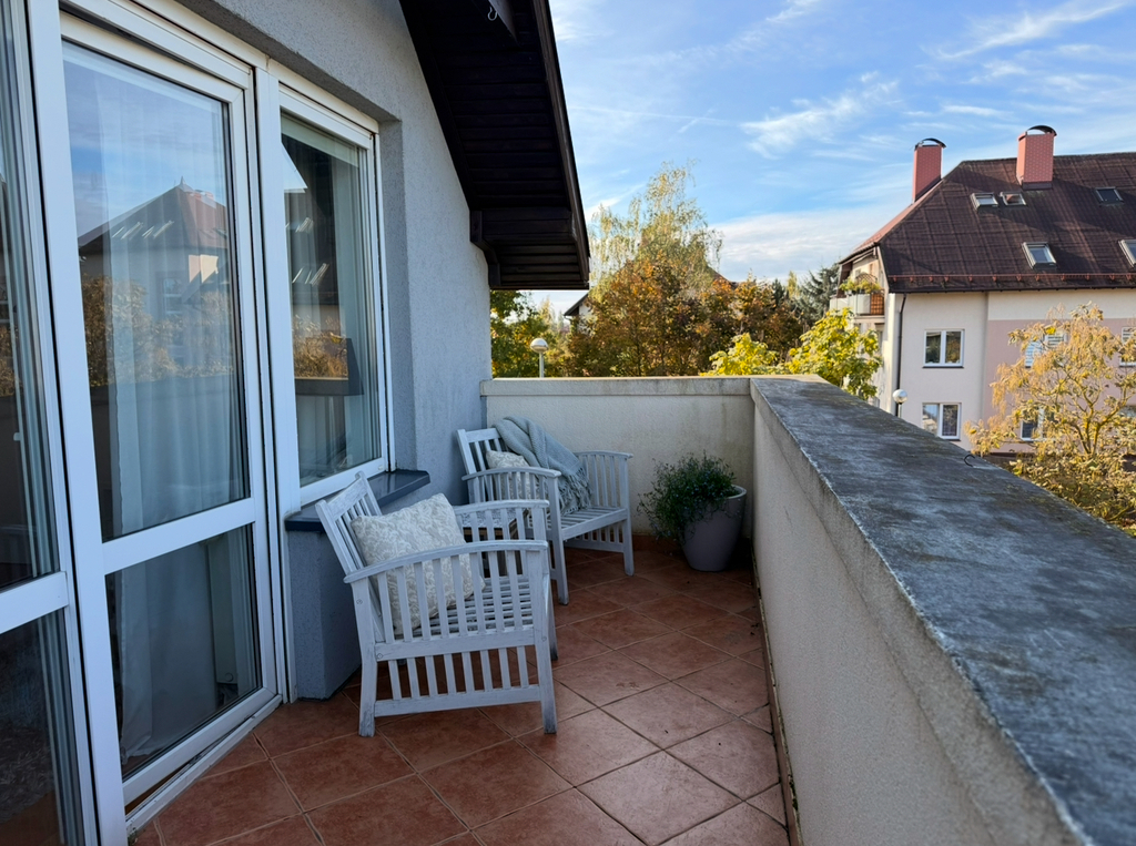 - jasny, słoneczny salon wejściem na duży balkon