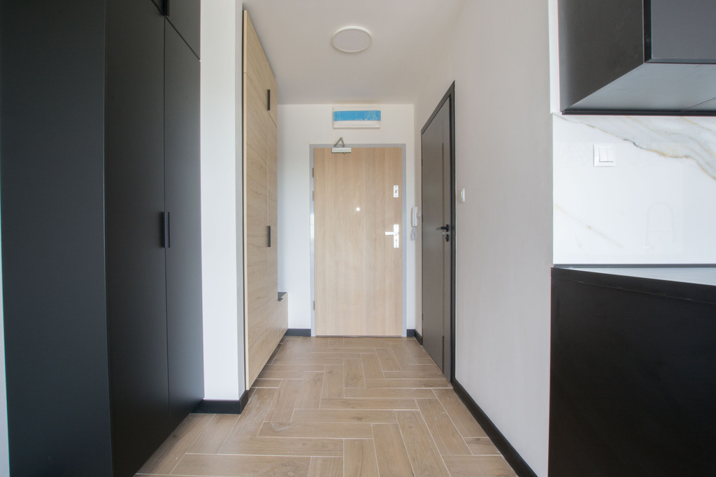 W przedpokoju dwie duże szafy z półkami oraz miejscem na wieszaki oraz szafka z siedziskiem dla wygodnego ubierania butów.