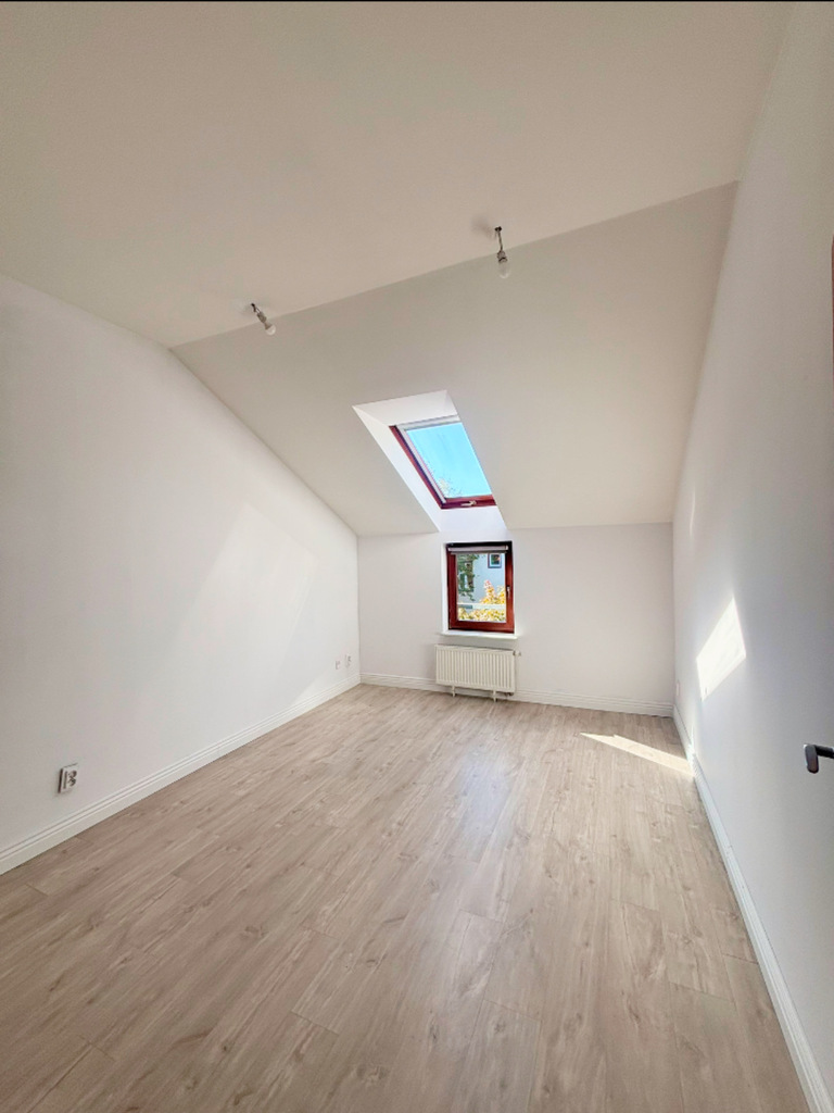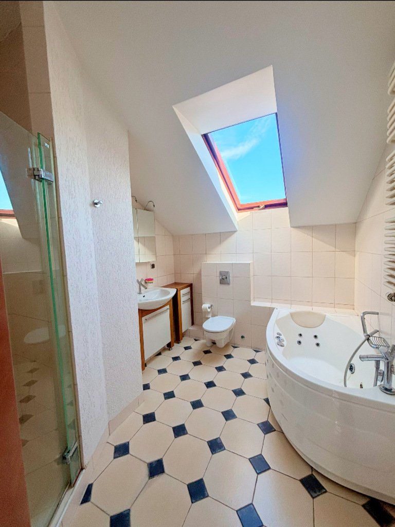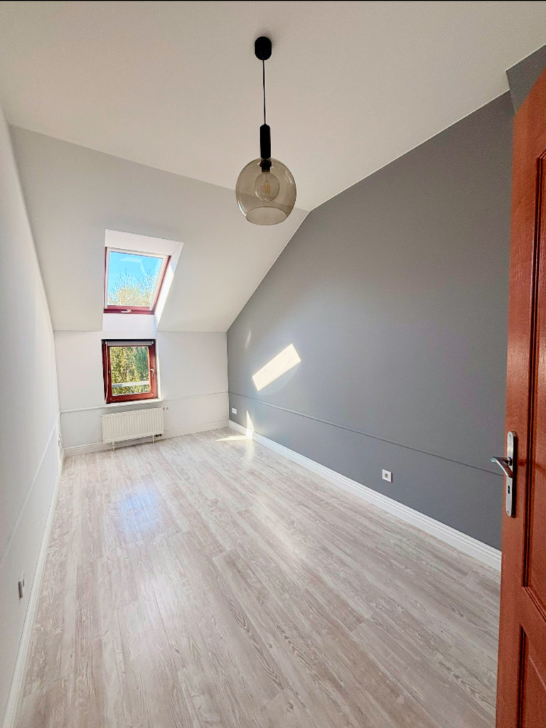 II poziom: 2 pokoje, łazienka z wanną i kabiną prysznicową, mniejszy pokój, który może funkcjonować jako dziecięcy lub pomieszczenie gospodarcze/ garderobę,