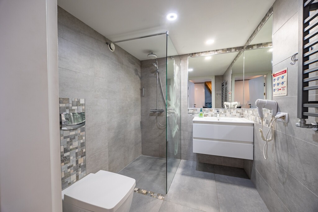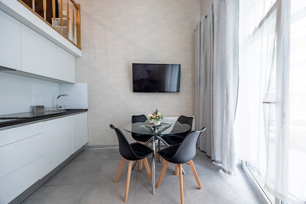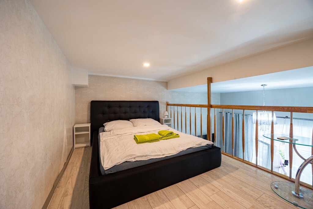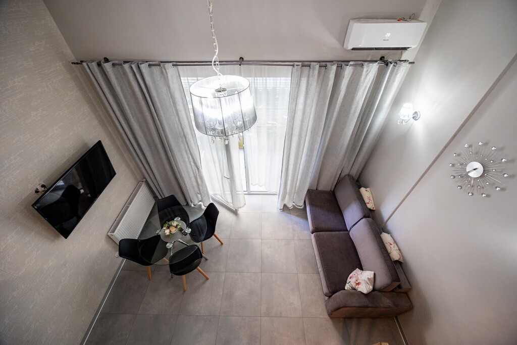 Na dole znajduje się rozkładana kanapa dla dwóch osób, a na antresoli wygodne łóżko – apartament może komfortowo pomieścić 4 osoby. Z dużego balkonu rozciąga się boczny widok na morze – idealne miejsce na poranną kawę.