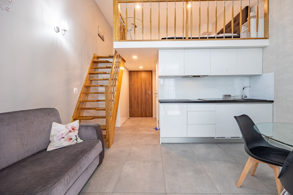 Lokal składa się z pokoju dziennego z aneksem kuchennym oraz łazienki. Dodatkowym atutem jest antresola o wysokości ok. 1,7 m – to pełnowartościowa przestrzeń sypialniana, która nie jest wliczona do powierzchni użytkowej, dzięki czemu apartament oferuje znacznie więcej miejsca niż wskazuje metraż.