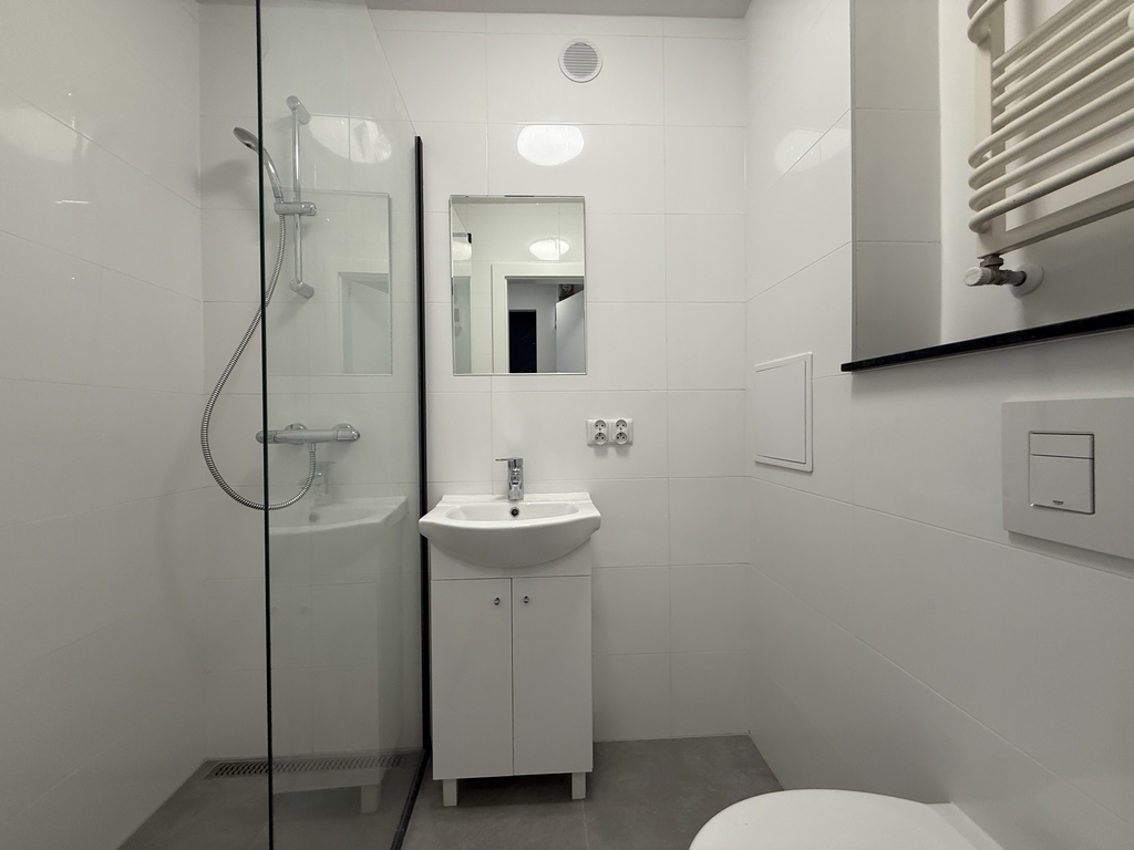 Na ścianach położono gładzie, na podłodze kafle. Łazienka z nową armaturą.