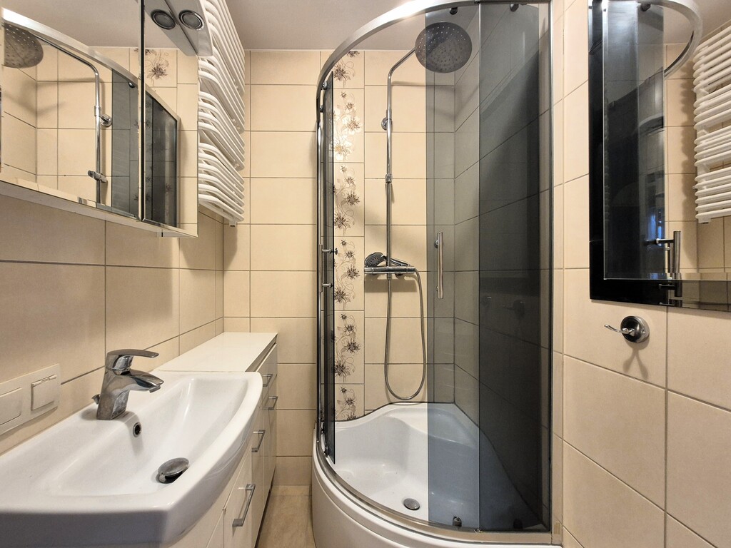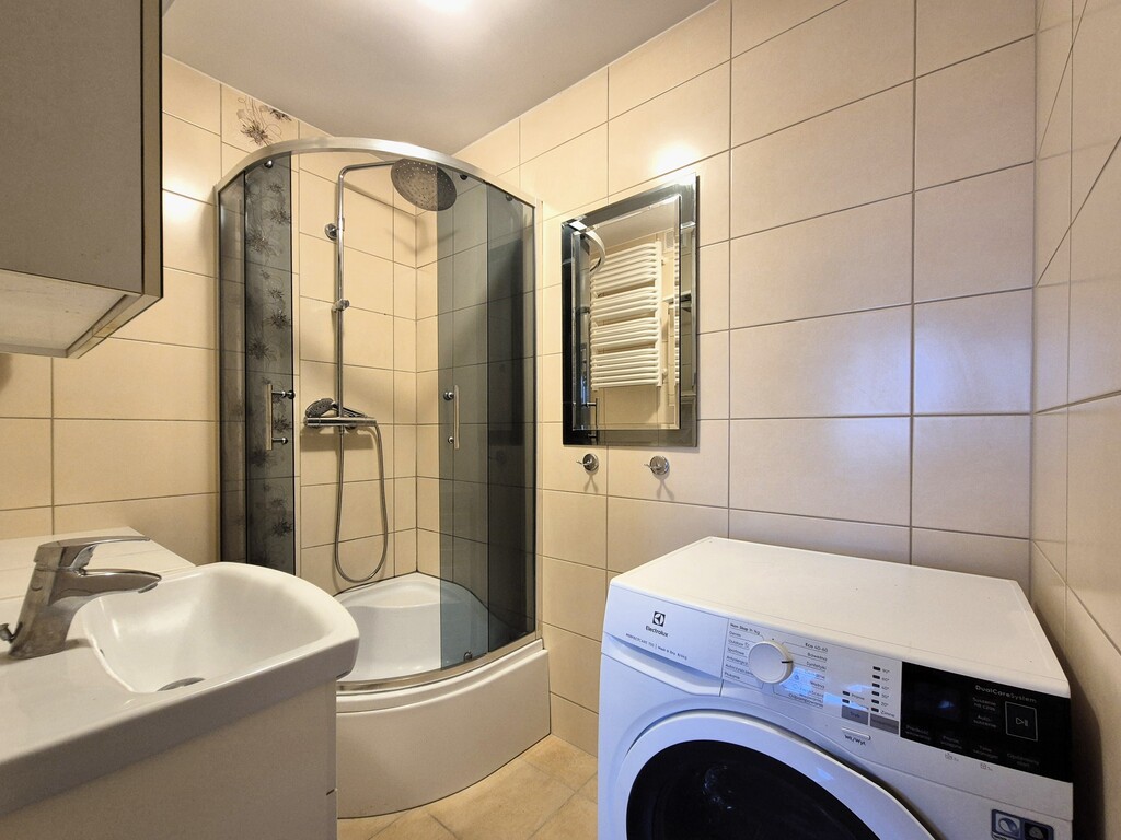 * łazienka z prysznicem, umywalką i pralko-suszarką