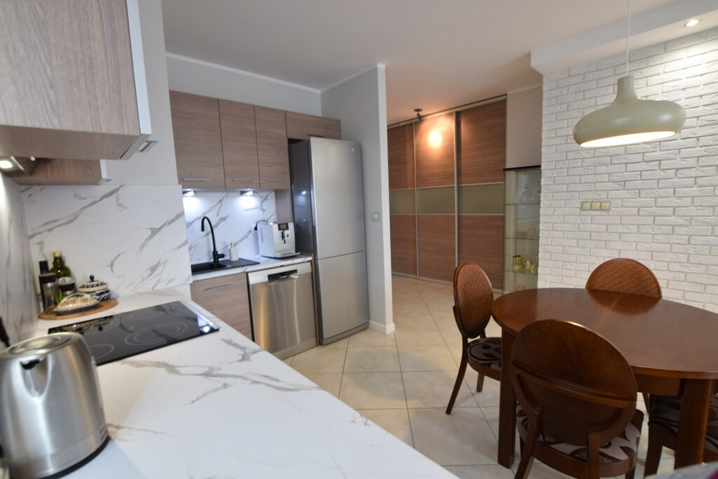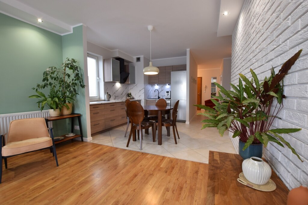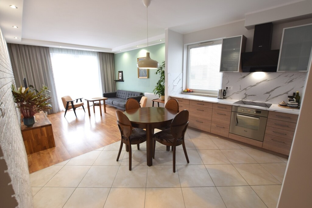 Mieszkanie urządzone zgodnie z nowoczesnymi trendami wyposażenia wnętrz o bardzo korzystnym układzie pomieszczeń (odseparowana część sypialna od salonu i kuchni).