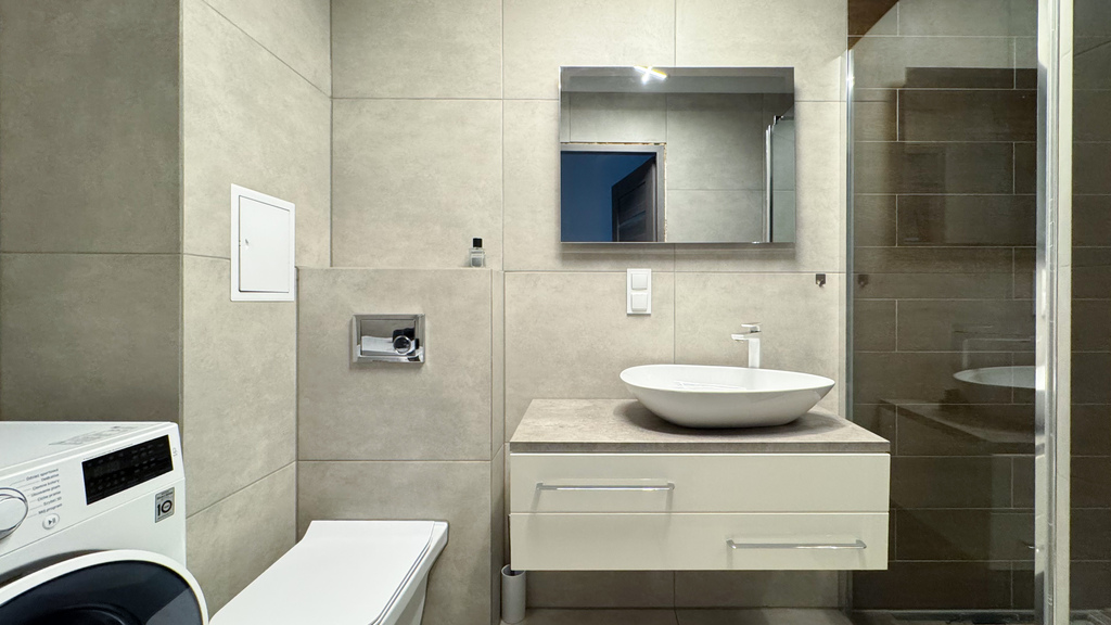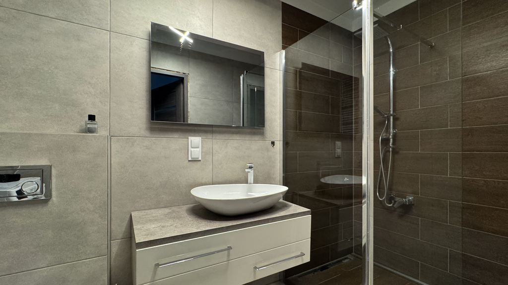 Łazienka z prysznicem wykończona w nowoczesny sposób.