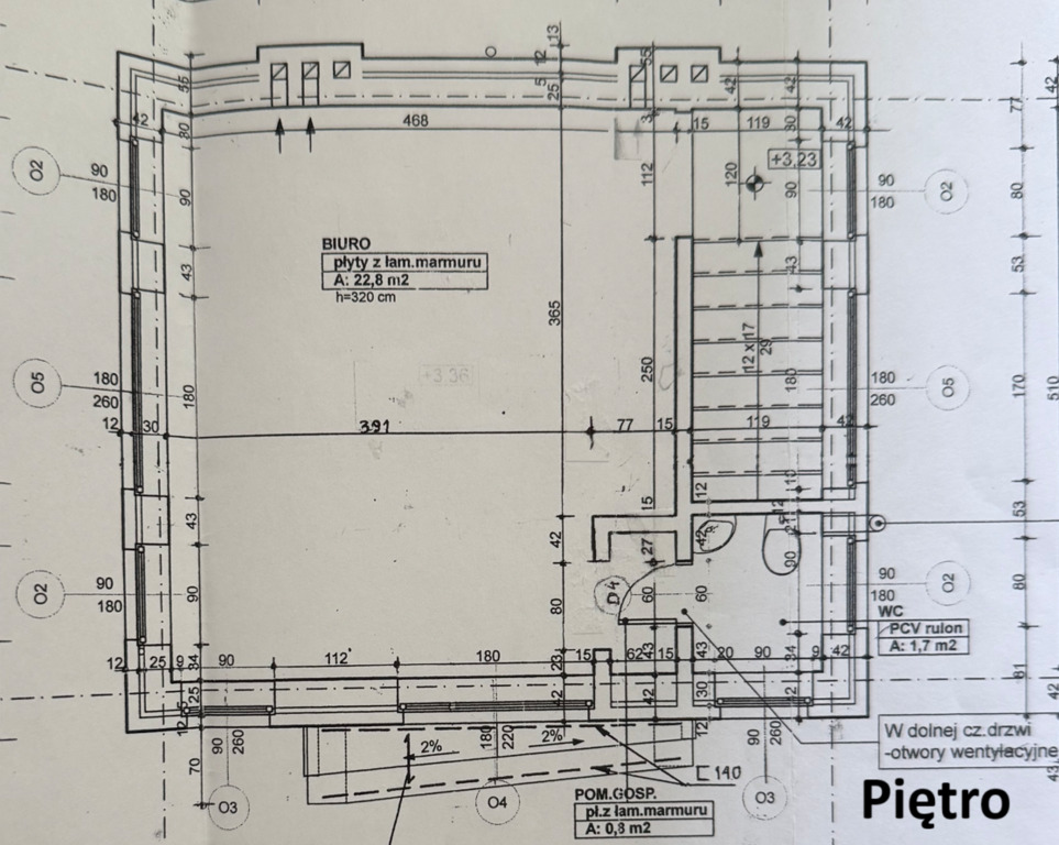 piętro: - biuro o pow. 22,8 m2 - aktualnie wydzielone dwa pomieszczenia . - toaleta o pow. 1,7m2 - pom. gosp. o pow. 0,8 m2