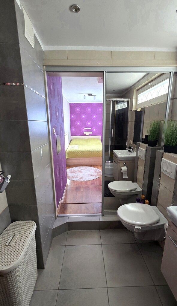 • 2 sypialnie (jedna, mniejsza sypialnia ma bezpośrednie sąsiedztwo z łazienką)