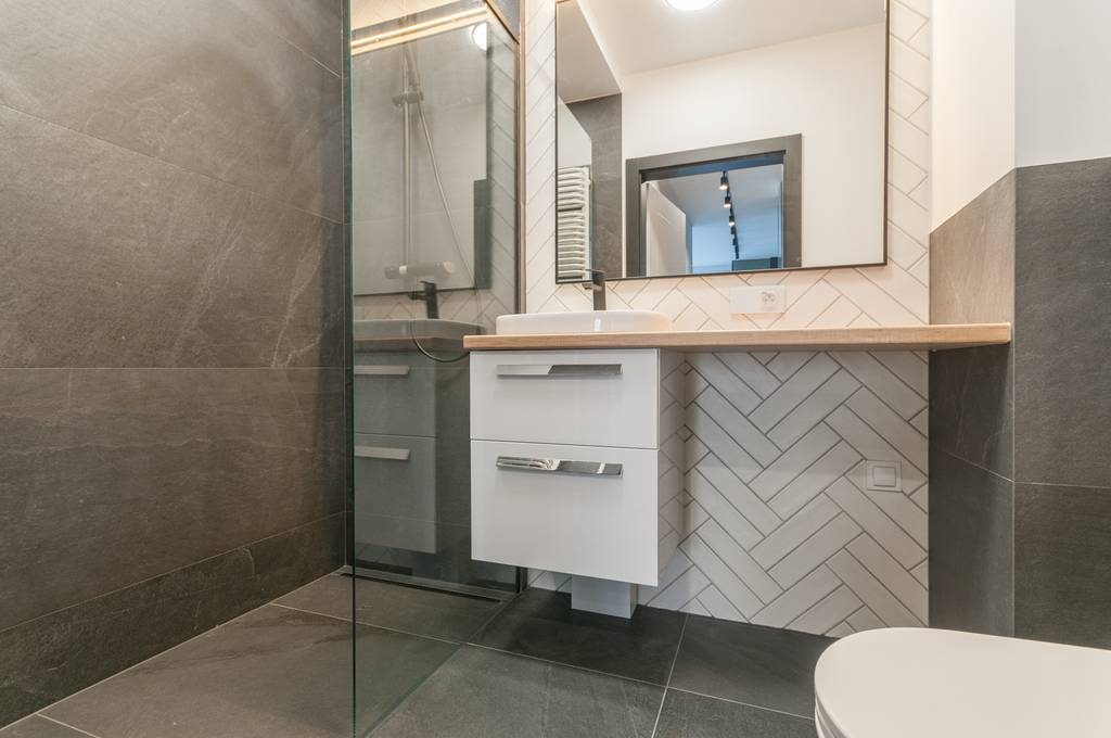 * łazienka wykończona w kaflach, z kabina prysznicową typu walk-in; zabudowany geberit, szafka z umywalką,