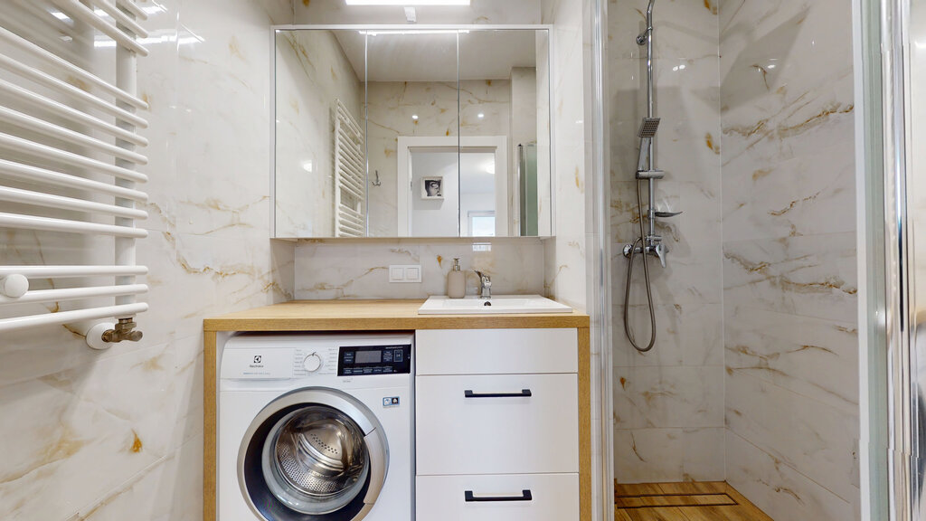 - łazienka z prysznicem, zabudową i pralką