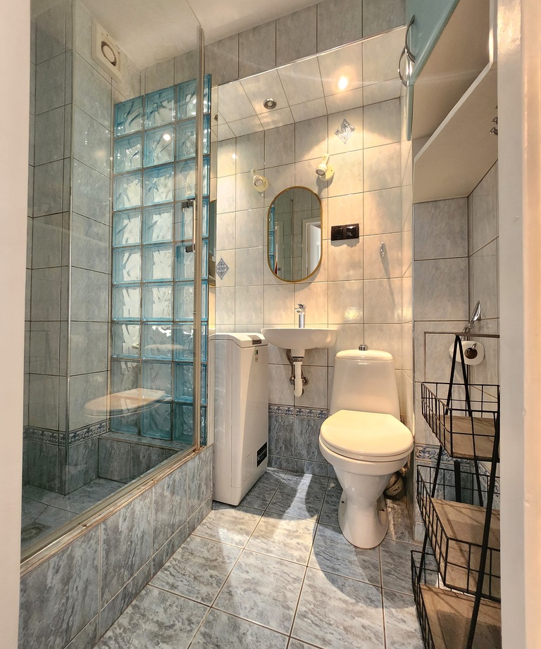 Kuchnia ustawna z meblami w zabudowie. Łazienka wyposażona w kabinę prysznicową.
