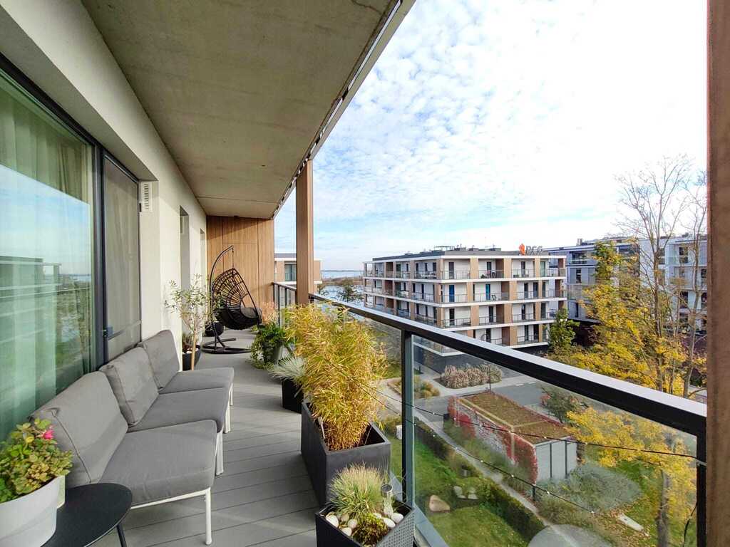Zrelaksuj się z kawą na tarasie gdzie z jednej strony rozprzestrzenia się widok na wzgórza i lotnisko, z drugiej na jezioro Małe Dąbie z przystanią jachtową.
