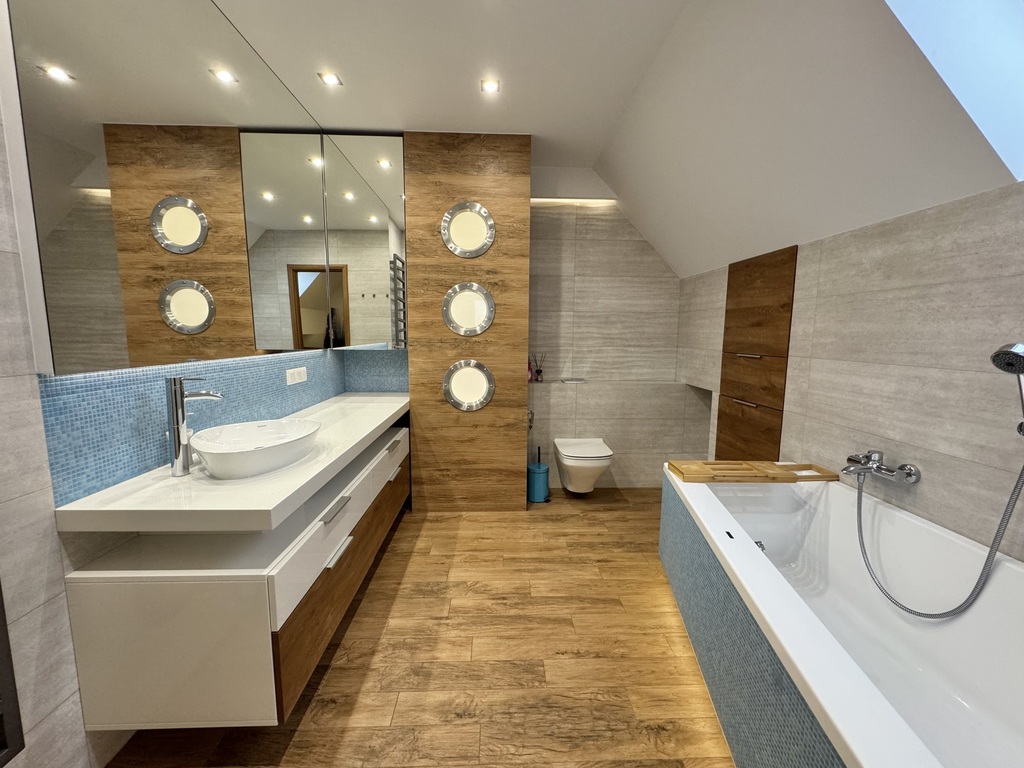 *łazienka wyposażona w wannę, umywalkę, WC, bidet oraz okno