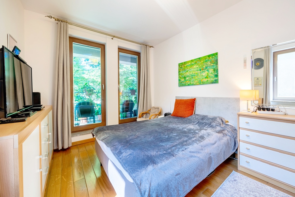 Mieszkanie, w którym każdy detal został dopracowany, by zapewnić najwyższy komfort codziennego życia. Duże, panoramiczne okna pozwalają cieszyć się widokiem na zieleń i dają poczucie przestronności. Dzięki wysokim sufitom (2,90 m), wnętrza wydają się jeszcze bardziej przestronne, co dodatkowo podkreśla elegancki charakter tego apartamentu.